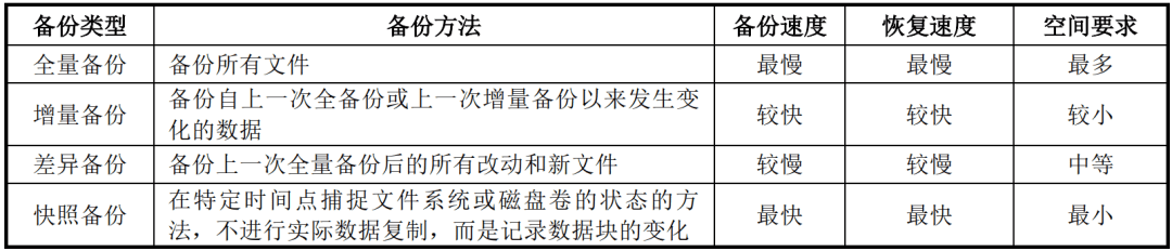数据备份取恢复的方式有良多种,如全备份、增量备份、差别备份和快照等。全备份供给了完整的数据副本,但占用存储和备份时间最长;增量备份节流存储空间和时间,但恢复过程复杂;快照则以快速建立和高效的空间操纵见长。
