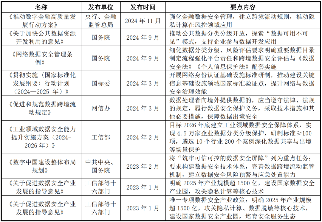 近几年,地方、国务院及央行、金融监管总局、工信部等多部分稠密出台系列政策鞭策数据平安及相关行业成长。
